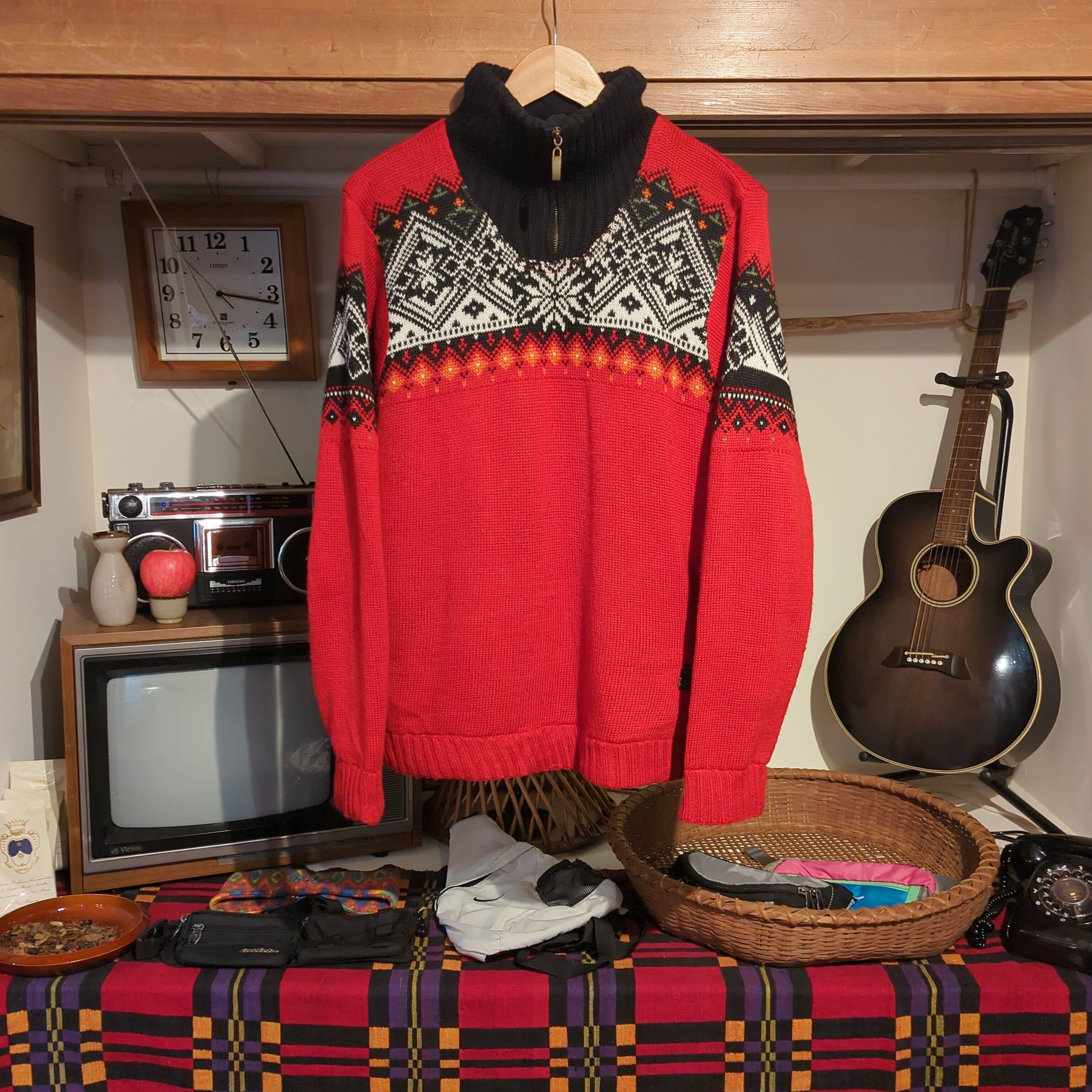 バチバチな配色のノルディック柄のハーフジップセーターです。