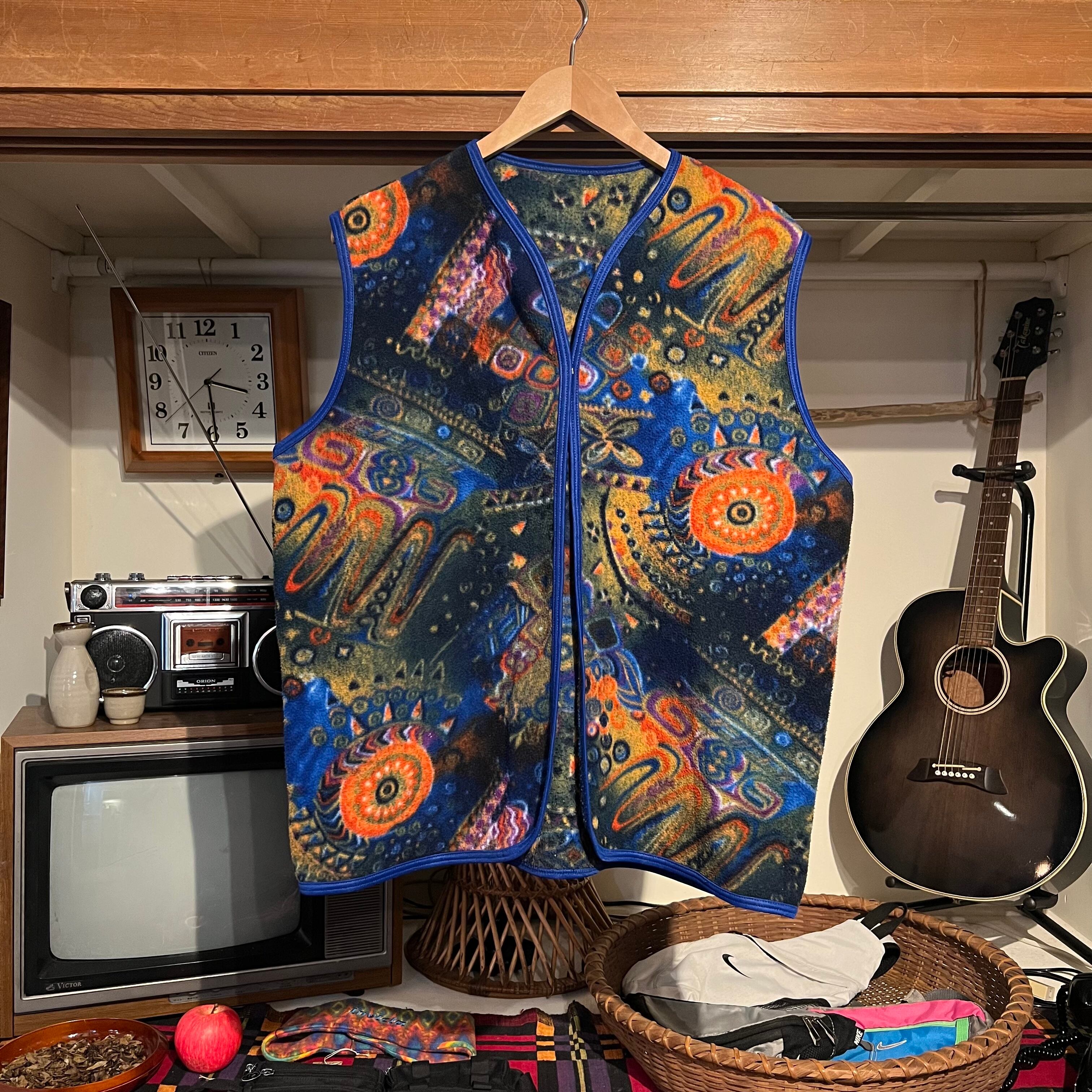 繊細な幾何学柄がプリントされたフリースのベストです。